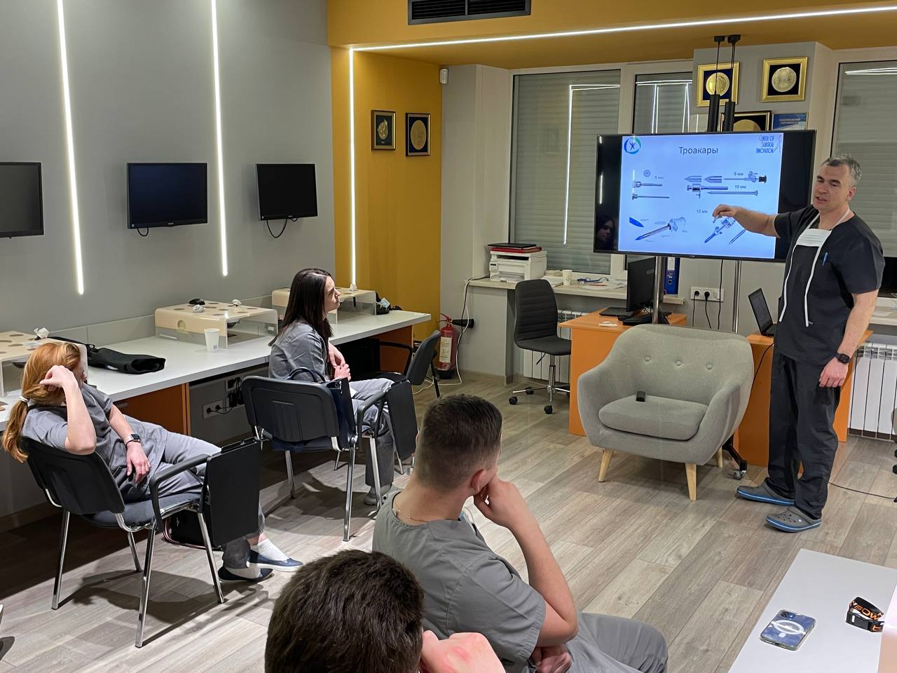 На лапароскопічних тренажерах курсанти відпрацьовували навички диссекції, лігування, шиття та формування вузлів.