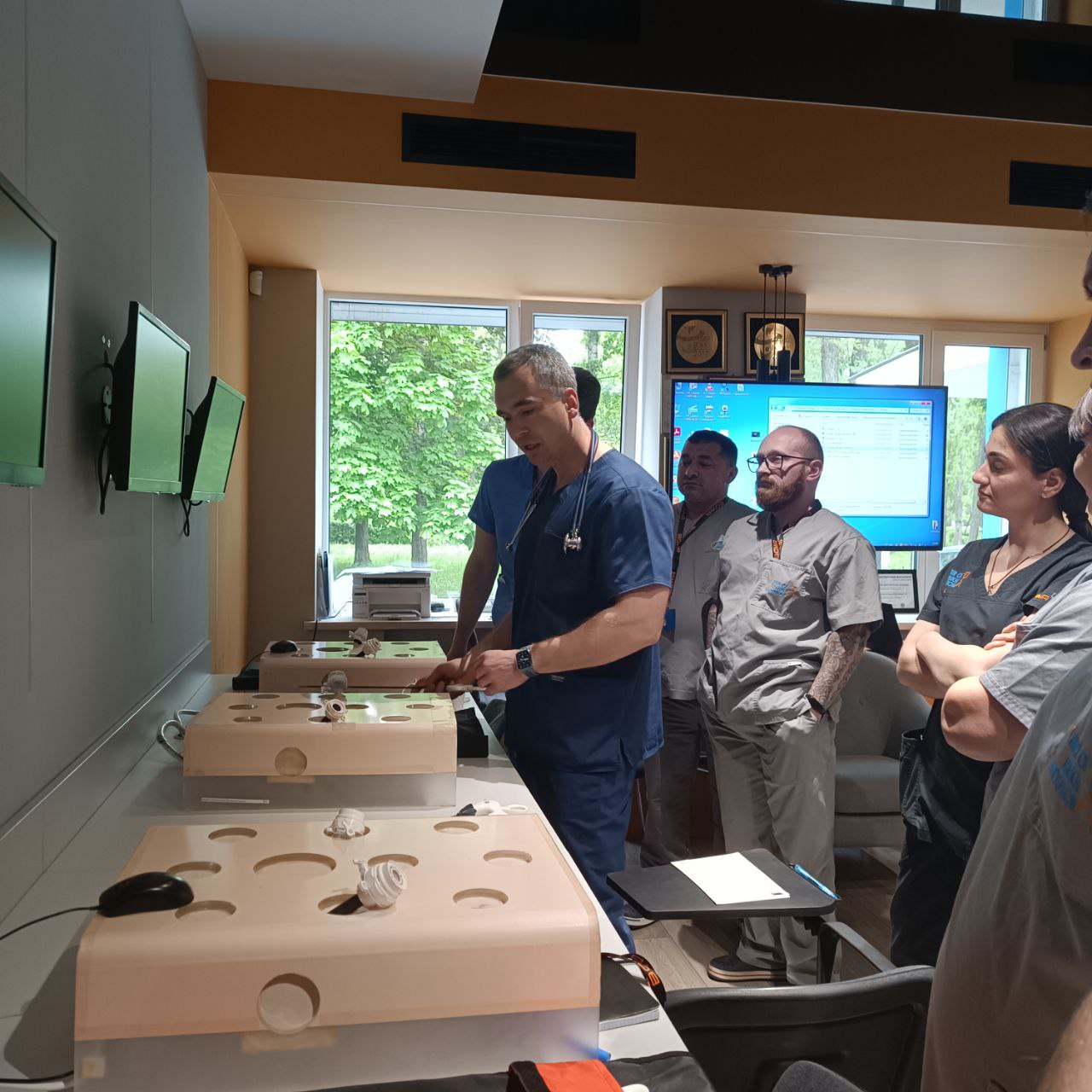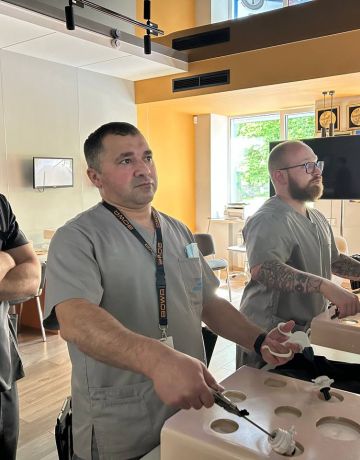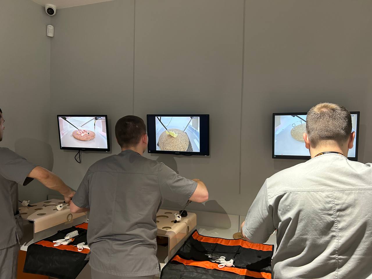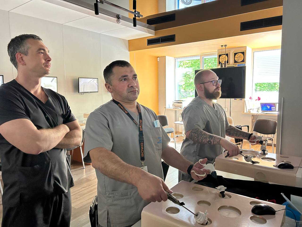 На лапароскопічних тренажерах курсанти відпрацьовували навички диссекції, лігування, шиття та формування вузлів.