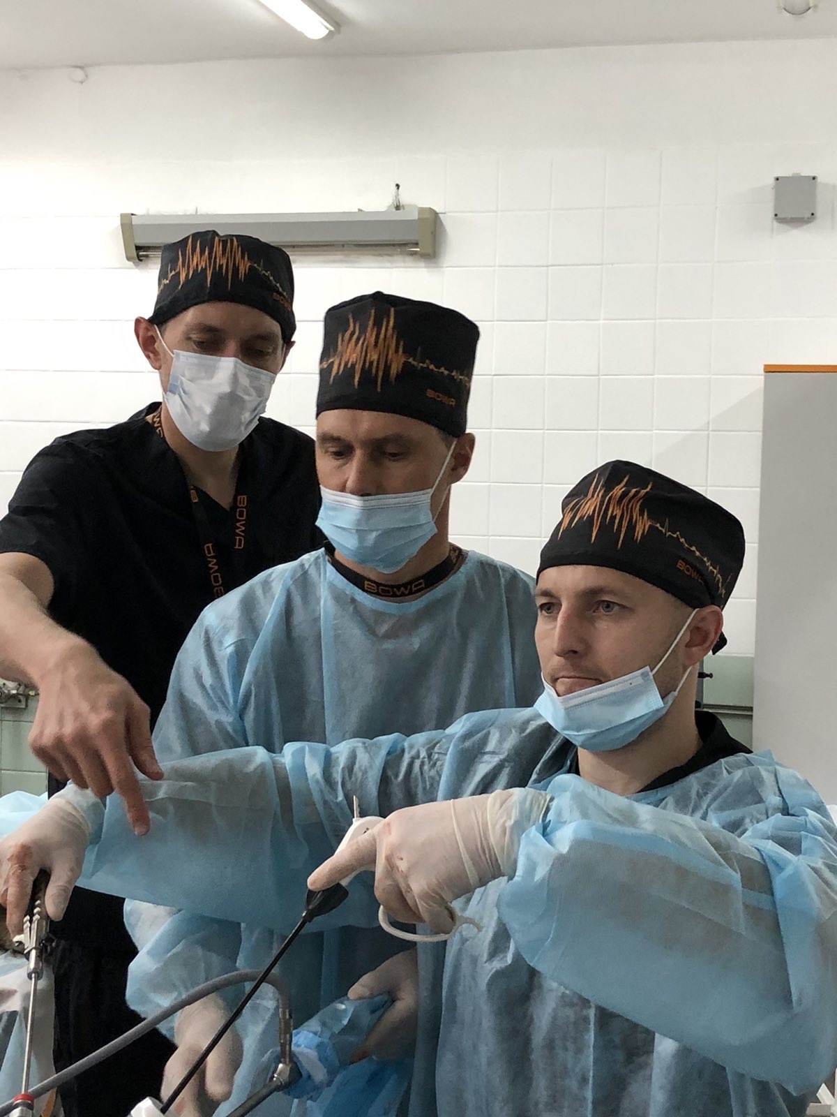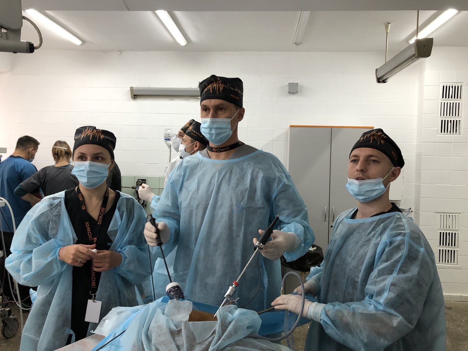 Під час «вет лаб» практики курсанти мали можливість застосувати отримані лапароскопічні навички в умовах роботи на лабораторних свинях, випробувати в роботі високочастотні, плазмові й ультразвукові апарати від провідних світових виробників хірургічного обладнання. Під керівництвом куратора курсу хірурги успішно відпрацювали резекцію нирки і нефректомію.