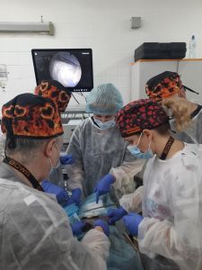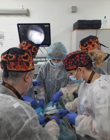 Під час VET LAB практики учасники курсу відпрацьовували навички накладення пневмоперитонеума, розстановки троакарів, навігацію камерою, маніпуляції інструментами в черевній порожнині, вивчили правила використання різних енергій на живих тканинах, накладення інтра- і екстракорпоральних швів.