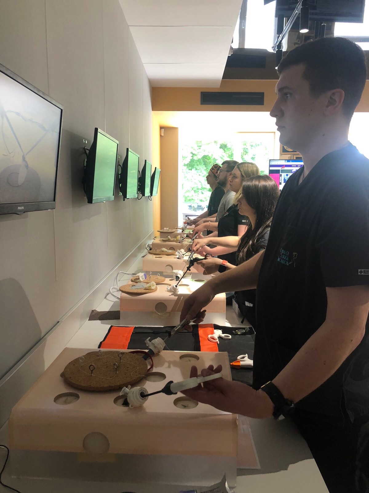 На лапароскопічних тренажерах курсанти відпрацьовували навички диссекції, лігування, шиття та формування вузлів.